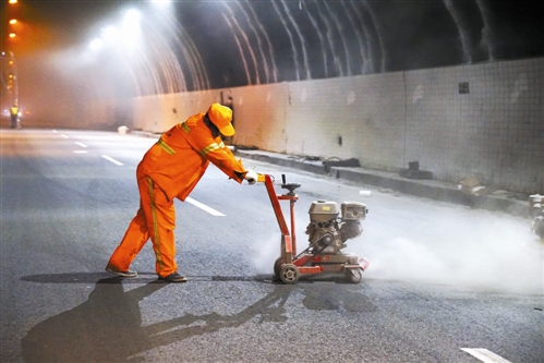 走進(jìn)隧道,一股冷風(fēng)侵襲,洞內(nèi)風(fēng)大又潮。來自湖北的游師傅,負(fù)責(zé)噴隧道墻面乳膠漆。他有著20多年的豐富經(jīng)驗(yàn),在施工現(xiàn)場,他頭戴安全帽,身穿反光背心,緊系安全繩,一個(gè)人站在高高的架子上,底下4名工人不時(shí)緩緩地推動(dòng)登高架。游師傅全然不顧洞內(nèi)的濕冷,大手一揮,熟練而均勻地噴灑著油漆,沒多久墻面便嶄新一片。