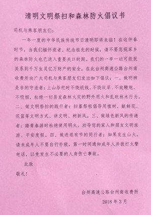 圖為倡議書(shū) 為增強(qiáng)防火意識(shí),做到文明祭掃,3月16日上午,臺(tái)州南收費(fèi)所在向過(guò)往司乘人員發(fā)放《清明文明祭掃和森林防火倡議書(shū)》,倡議大家做明辨是非的守法者:不燒紙錢、不放鞭炮、杜絕野外用火和亂伐林木行為;做文明祭掃的踐行者:提倡用植樹(shù)、獻(xiàn)鮮花、花籃等方式祭祖;做綠色新風(fēng)的傳遞者:勸導(dǎo)家人和朋友文明出游;做進(jìn)退有節(jié)的同行者:發(fā)生山火,理智救火。
