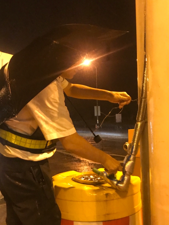 8月9日21點(diǎn)22分,風(fēng)雨越來越大,臨海南收費(fèi)所車道水管被狂風(fēng)吹得隨意搖晃,當(dāng)班收費(fèi)員李俊杰不顧狂風(fēng)暴雨,第一時(shí)間拿上鐵絲冒雨捆綁,防止砸到過往車輛,保證了車道安全暢通。