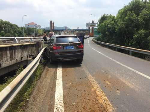 8月13日上午10:30分左右,臺州收費所出口寧向匝道口有一輛黑色寶馬X3斜靠在護欄旁,其車頭左側(cè)因碰撞護欄而嚴(yán)重凹陷,左前輪胎報廢。 當(dāng)時,該所出口五號車道的欄桿發(fā)生故障,需要暫時關(guān)閉進(jìn)行維修。班長張海勇在內(nèi)廣場引導(dǎo)車輛時發(fā)現(xiàn)此起事故,走近細(xì)看,由于碰撞激烈該車前檔玻璃破裂,前排安全氣囊彈出,而車旁的兩個人驚恐未定不知所措。此時匝道口車流不斷,因駕駛員遲遲找不到三角牌,為避免二次事故的發(fā)生,張海勇在車后方指揮交通,并提醒車旁人員站在護欄外安全位置,同時報告指揮中心事故車的位置和損傷情況。