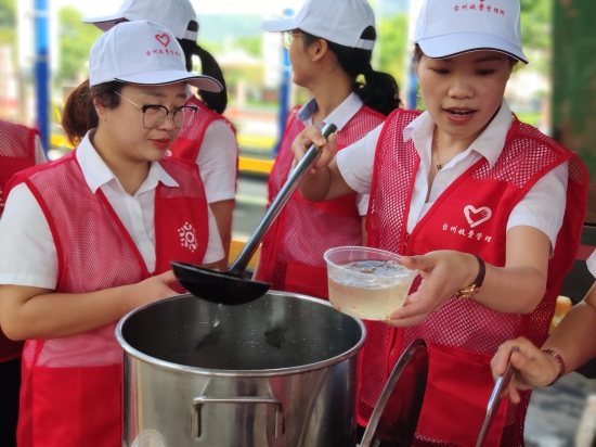 圖為志愿者合影 上午9點(diǎn),志愿者們身著統(tǒng)一紅馬甲,在崗?fù)さ陌踩珝u上設(shè)立服務(wù)臺(tái),抬出食堂提前制作好的青草糊、綠豆湯等清涼飲品。你來(lái)分杯我來(lái)送,大家不亦樂乎開始了送清涼活動(dòng)。