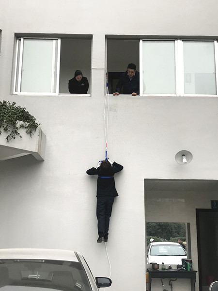 圖為高處逃生演練現(xiàn)場(chǎng) 理論培訓(xùn)結(jié)束后,溫嶺西收費(fèi)所隨即開(kāi)展實(shí)地逃生演練,讓員工學(xué)習(xí)使用逃生繩從高處逃生的技能。在蔡教官的指導(dǎo)下,一名收費(fèi)員大膽地自我推薦,主動(dòng)嘗試此自救方法。 一切準(zhǔn)備就緒,該收費(fèi)員迅速爬上窗戶(hù),利用逃生繩小心地沿著墻壁下滑,并順利落地。教官最后根據(jù)演練情況作點(diǎn)評(píng)。 此項(xiàng)技能有助于在火災(zāi)時(shí)多開(kāi)辟一條逃生通道,減少人員傷亡。 通過(guò)此次全面的培訓(xùn)演練,溫嶺西收費(fèi)所將全力共抓消防安全工作,排除各類(lèi)隱患。 鄭霞霞