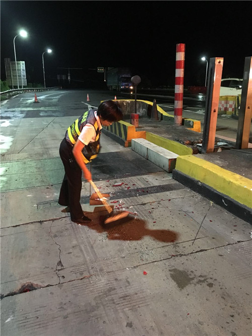 為了保暢通,收費(fèi)班長讓司機(jī)拍照后開到外面等待處理,車輛駛離車道后,發(fā)現(xiàn)稱臺上罩殼跟防護(hù)欄被擠彎,地上剩下一堆玻璃碎片殘?jiān)?。班長正在處理相關(guān)事宜時(shí),發(fā)現(xiàn)收費(fèi)員張小芬已經(jīng)麻利的在車道上清理殘余碎片,不多久就恢復(fù)了超寬車道通行。