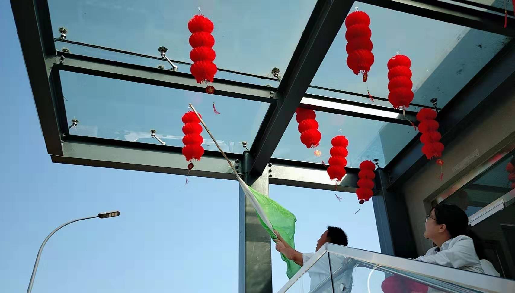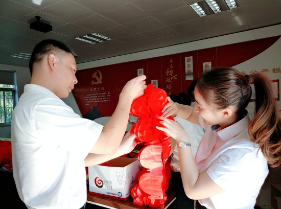 圖為工作人員一起布置收費所 在慶祝祖國70周年生日的日子里,最火的顏色就是紅色。為了弘揚中華民族傳統(tǒng)文化,溫嶺西收費所后勤組早早購置了燈籠、彩旗、五星紅旗,寫好“慶祝祖國70周年華誕”大字等。黨員帶頭,團員緊跟,一線收費員紛紛參與,在收費站大門口、辦公樓、食堂、宿舍等區(qū)域精心用五星紅旗、大紅燈籠、五顏六色的彩旗裝點,一抹抹艷麗的國旗紅,成為站點最靚麗的風景。明亮的黃、鮮艷的紅,美麗窗口突然亮了起來,到處洋溢著濃濃的國慶氛圍,為過往司乘提供暢、潔、美的節(jié)日行車環(huán)境。 溫嶺西收費所后勤組還精心策劃、精細編排,制作了具有特色、獨具創(chuàng)意的生日祝福“小視頻”,祝祖國生日快樂! 通過開展弘揚愛國精神,喜迎國慶活動,溫嶺西收費所全所工作人員更加不忘初心,砥礪前行,共同慶祝祖國70周年華誕。 鄭霞霞