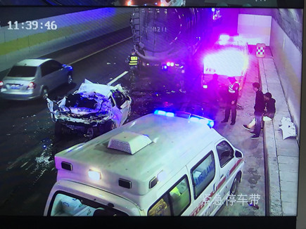 圖為事故現(xiàn)場 情況緊急,一接到指令,巡邏車立即在南廣場調(diào)頭,趕赴事故現(xiàn)場。而此時較大的車流量已造成后方堵車,導致巡邏車被堵在隧道口,執(zhí)勤隊員怕時間耽擱太久,便火速跑到事故現(xiàn)場,第一時間將車里的人員救出。所幸轎車內(nèi)四人只有一人腳上受傷,中控立即拔打120急救電話。在他們還在施救的時候,追尾事故卻頻頻發(fā)生,500米左右、1300米左右的超車道上先后發(fā)生兩小車、三車追尾事故,隧道內(nèi)排起了長龍。為了保證在最短時間內(nèi)恢復正常通行,執(zhí)勤隊員忙著奔赴現(xiàn)場指揮預警,應急救援有序展開。 現(xiàn)場,監(jiān)控中心、交警、執(zhí)勤隊等部門分工協(xié)作,整個施救過程一直持續(xù)到中午12點多才順利完成。盡管執(zhí)勤隊員到現(xiàn)在都滴水未進,但每個人臉上繃緊的神經(jīng)終于都得到了放松。 林玲