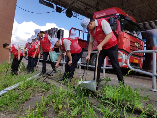 圖為志愿者合影 活動現(xiàn)場,身著紅馬甲的志愿者們,拿著垃圾夾、垃圾袋、掃把、畚斗等工具,重點清理收費站內外廣場的煙頭和白色垃圾。由于上下高速時有不少司乘人員直接把垃圾丟向兩側邊溝,導致收費所兩側邊溝垃圾較多。盡管天氣炎熱,但志愿者們自行分組,三人一組、五人一隊,充分發(fā)揮不怕苦不怕累不怕臟的精神,并互相配合集中對一些死角進行清理。