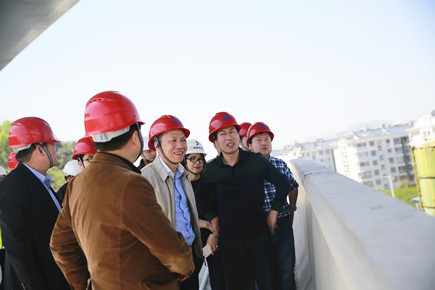 圖為公司總經(jīng)理張建平在8#立交橋上了解相關(guān)工程情況 張建平一行首先實(shí)地查看了內(nèi)環(huán)北路(江口段)項(xiàng)目工地進(jìn)行,聽取工程進(jìn)展情況匯報(bào)。在現(xiàn)場(chǎng),只見爆破量達(dá)到70%的安然山體已經(jīng)開辟出一條可供工程車輛通行的大口子,耳邊不停地傳來機(jī)器忙碌作業(yè)的轟鳴聲。張建平一路由東向西穿行在施工便道上,看到施工區(qū)域一側(cè)各種安全防范設(shè)施有序排列,感受到沿途濃烈的施工氛圍,他對(duì)此表示滿意。 途徑內(nèi)環(huán)路8#立交項(xiàng)目工地時(shí),張建平沿著臨時(shí)搭設(shè)的通道,爬上8#立交橋,遠(yuǎn)眺8#立交放射線項(xiàng)目所在地,向有關(guān)人員了解該項(xiàng)目前期準(zhǔn)備工作情況。眼下,距離11月11日內(nèi)環(huán)路主線通車僅剩下近半年的時(shí)間,張建平強(qiáng)調(diào),各部門要努力抓好施工進(jìn)度,保證工程質(zhì)量,更要時(shí)刻將安全放在首位。 陳林偉