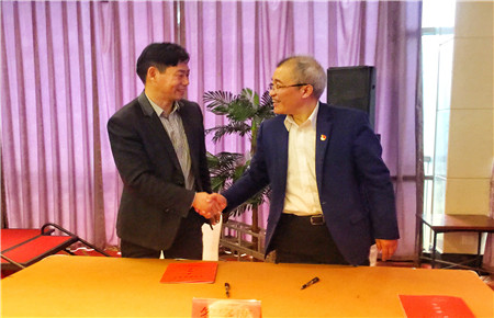 圖為集團(tuán)副總經(jīng)理陳保衛(wèi)與國(guó)資委主任徐豪簽訂責(zé)任書(shū)后握手