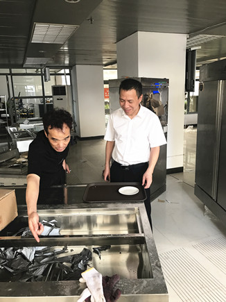 圖為公司副董事長(zhǎng)、總經(jīng)理張建平于7月1日到大樓檢查指導(dǎo)食堂整改工作