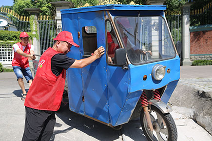 上圖為志愿者服務(wù)隊合力推離停放不規(guī)范的電瓶車、三輪車