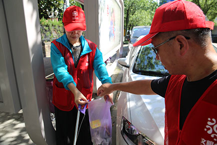 圖為志愿者撿拾垃圾,撕除車窗上的小卡片