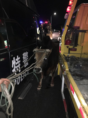 警報(bào)拉起,警燈閃爍,猛牛在施救車和巡邏車護(hù)送下,走過黃土嶺隧道,并在警車引導(dǎo)下,走向臺(tái)州收費(fèi)所出口。晚7:00時(shí)在即將出口時(shí),牛開始受驚,四處突圍,為避免事故,飛速趕過來的臺(tái)州110特警擊中了牛蹄,制伏了開始發(fā)瘋的牛。費(fèi)了老大力氣,特警、交警及施救人員總算合力將牛抬上施救車安全帶下了高速公路 。 據(jù)悉,這起事件由于一輛運(yùn)牛的貨車沒有做好安全措施,行駛過程中,牛逃下了車。所幸,處置到位,沒有釀成安全事故 。 鄭蔚