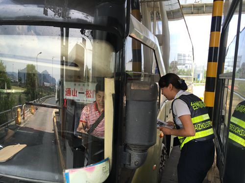 在臺(tái)州南收費(fèi)所車道里,收費(fèi)班長(zhǎng)辛舟飛正細(xì)致耐心地向客車司機(jī)進(jìn)行政策宣傳和解釋。