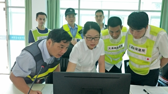 圖為項同富一行檢查大溪嶺隧道所中控系統(tǒng)