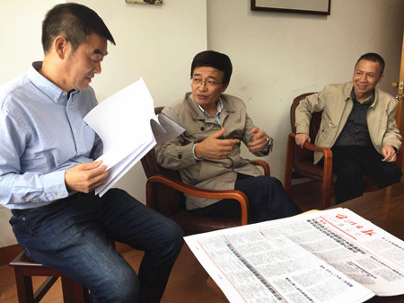 圖為市國資委主任徐豪和集團總經(jīng)理張建平一起走訪市財政局股東單位