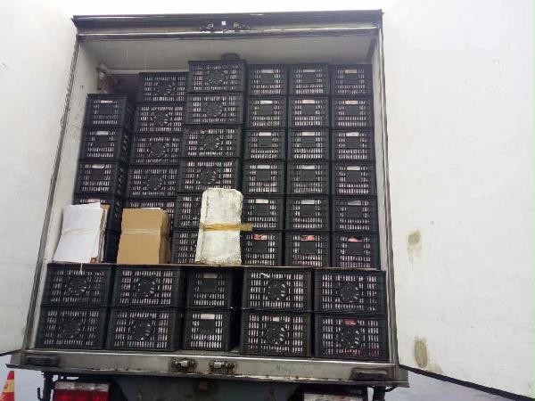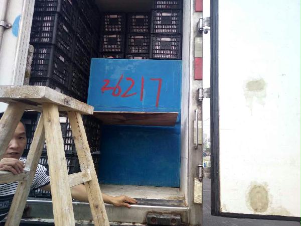 圖為被處罰的車輛 早上10點40分左右,這輛運蘋果的貨車駛?cè)胧召M站的一號崗亭,司機師傅說自己運的是蘋果,根據(jù)公司規(guī)定,綠農(nóng)車檢查必須開車門檢查貨物。憑著多年的檢查經(jīng)驗,當班班長童軍偉發(fā)現(xiàn)這輛綠農(nóng)車有問題,覺得重量遠遠不夠,可能不符合“綠農(nóng)”免費政策。果不其然,車廂中“深藏玄機”,左右兩側(cè)各有一排玻璃鋼魚箱,這就給檢查增加了難度。當班班長要求司機師傅把最后兩排箱子拿掉,想檢查玻璃魚缸,然而這個司機極其不配合,還惡意刁難工作人員,說什么也不搬蘋果。