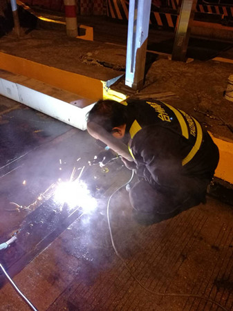 到了現(xiàn)場,隊(duì)員發(fā)現(xiàn)該車道輪檢器鐵板螺孔由于不斷摩擦并逐漸變大,導(dǎo)致整顆螺栓脫離底下固定螺座,加之當(dāng)天是春節(jié)高速免費(fèi)第一天,車輛經(jīng)過時(shí)車速都較快,直接將整塊鐵板帶離底座。如果不及時(shí)對(duì)鐵板進(jìn)行加工恢復(fù),不僅不能保護(hù)下面的輪檢器,而且還有可能造成車輛爆胎??沙σ谷考庸S都已關(guān)門,如果讓廠家發(fā)貨至少也要好幾天。正在兩難之際,中心副經(jīng)理葉俊想到將鐵板與底座邊緣直接焊死的臨時(shí)應(yīng)急方法,待節(jié)后再向廠家定制或重新購買。 方案有了,大家兵分兩組,一組去中心倉庫拿電焊機(jī)、電焊條等設(shè)備,一組待在原地清理鐵底下方於泥等雜物,為隨后的電焊工作做準(zhǔn)備。設(shè)備到位后,葉俊一手操起電焊罩,一手熟練的將電焊條點(diǎn)在了鐵板與底座邊緣之間,經(jīng)過近一個(gè)小時(shí)的處理,輪檢鐵板與地面底座牢牢地固定在一起,再也不用被飛馳而過的車輛帶離。 項(xiàng)寅曉