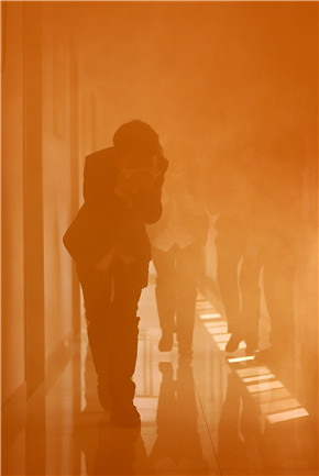 圖為參演人員在火災(zāi)演練中有序撤離