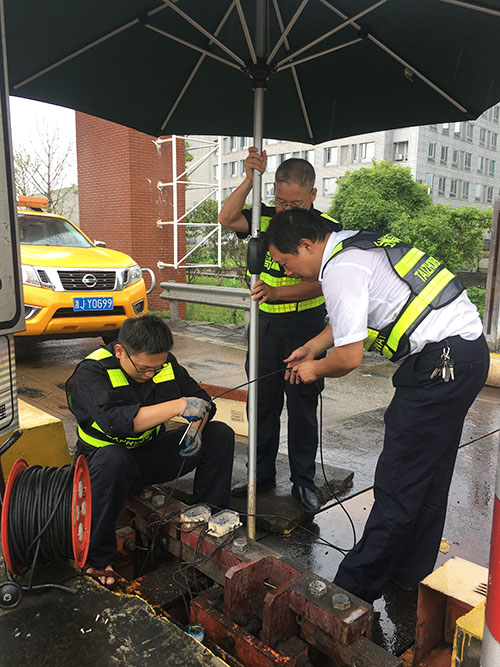 可是天公不作美,經(jīng)過一夜,雨還持續(xù)飄落著,收費站出口車輛逐漸增多,再不檢修將會導致其他車道通行壓力越來越大,可是如果冒雨檢修則有損壞設備的風險。正在兩難之際,中心負責人葉俊向兄弟單位借來了一頂大型遮陽傘,在大傘遮擋下,搶修小組不顧前晚疲憊,對稱臺的4組傳感器用萬用表進行了一一檢測,結(jié)果顯示也全部正常。 “可為何組合起來傳輸?shù)教幚砥魃系臅r候計重數(shù)據(jù)就不正常了呢,難道問題出在這根數(shù)據(jù)線上?”順著這個思路,搶修人員慢慢地將這根線從線井中拉出,果不其然,在線的中間位置發(fā)現(xiàn)了被老鼠咬破的裂痕。為使數(shù)據(jù)傳輸更加穩(wěn)定可靠,搶修人員采用了整體更換方式,重新穿線再將兩頭的接點用電烙鐵進行焊接,經(jīng)過一個多小時地奮力搶修,稱臺故障終于排除,該車道也恢復正常通行。此時,搶修人員后背濕透,分不清是汗水還是雨水……