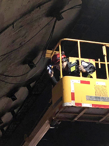 圖為各方人員集聚商討搶修方案 黃土嶺隧道所立即啟動(dòng)應(yīng)急搶修預(yù)案,聯(lián)合高速交警、工程養(yǎng)護(hù)部、施救中心展開緊急搶修工作。現(xiàn)場(chǎng),各方人員集聚商討搶修方案、檢查安全措施、布置搶修作業(yè)。登高車上,黃土嶺隧道所執(zhí)勤二隊(duì)隊(duì)長(zhǎng)林朝波等一批搶修人員率先清理斷落的電纜,調(diào)整接線、緊固螺栓……各項(xiàng)工作環(huán)環(huán)緊扣,緊張而有序。