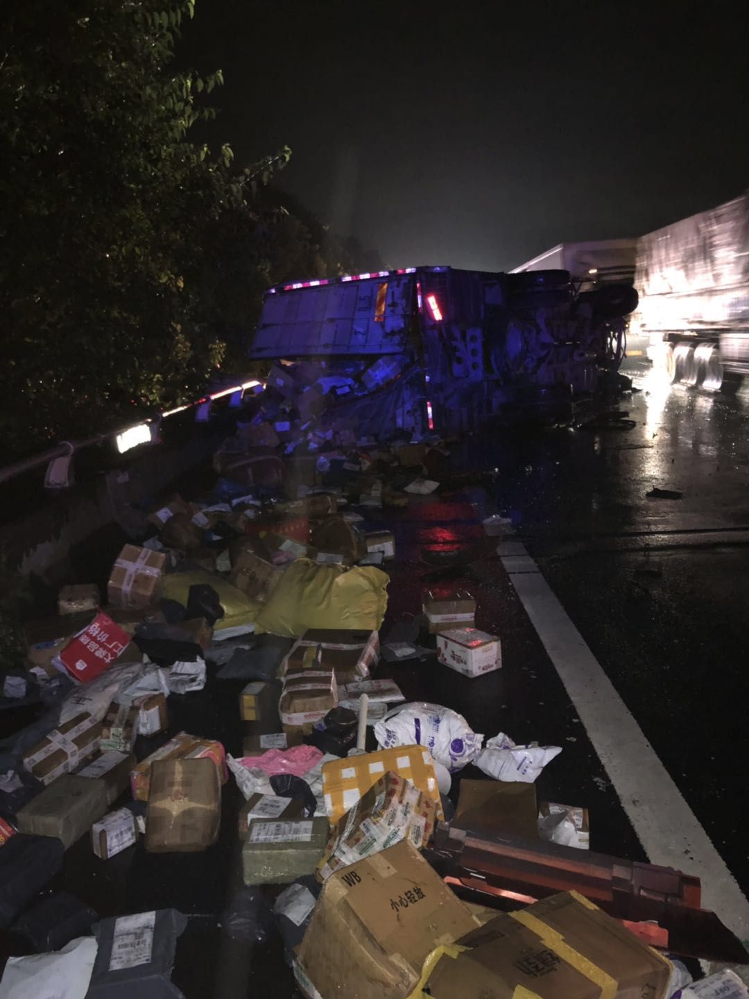 7月14日凌晨1點(diǎn),溫州方向臺(tái)州南收費(fèi)所附近,一輛半掛型大貨車和一輛快遞車相撞,半掛車直接沖出高速,四腳朝天??爝f車則是被巨大的沖擊力撞向了硬路肩,側(cè)翻中撒下數(shù)十米的貨物。1點(diǎn)10分,救援車輛到達(dá)現(xiàn)場,現(xiàn)場一片狼藉,防撞護(hù)欄板、護(hù)欄柱損傷嚴(yán)重,橋梁鋼管都折斷了不少。