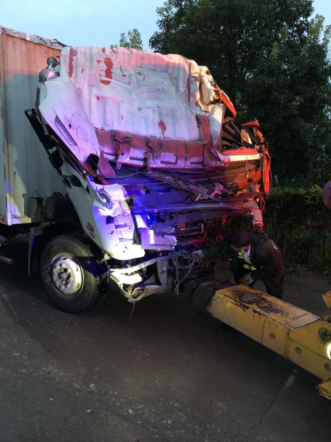 4點(diǎn)30分,快遞車被成功拖離高速,兩人回到現(xiàn)場開始對(duì)半掛車進(jìn)行救援。經(jīng)過2個(gè)多小時(shí)的不斷調(diào)整、嘗試,盡管出動(dòng)了兩輛吊車,但是半掛車的車頭死死地卡在樹里,吊車的力量無法撼動(dòng)。“砍樹!”最原始的方法往往是最有效的方法。一群人馬上拿工具把卡住車的部分砍斷。