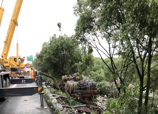 7點(diǎn),兩輛吊車聯(lián)動(dòng),終于成功將半掛車車頭成功吊動(dòng)。