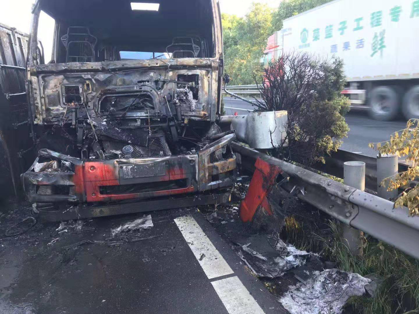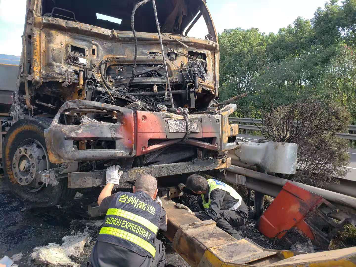 大火在現(xiàn)場(chǎng)留下了幾乎成為殘骸的兩輛車、滿地的油污、車輛碎片、燒剩下的布匹,一股刺鼻的臭味一公里外都聞得到。油污讓路道變得又膩又滑。更為嚴(yán)重的是,隨著時(shí)間的推移,從事故點(diǎn)開始,堵車開始一公里一公里的蔓延,幾乎快到了臺(tái)州收費(fèi)所。