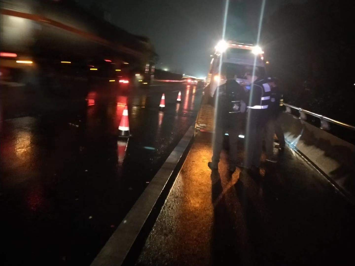 距離事故點最近的院橋駐點施救人員陳偉與潘志平接到指揮中心指令后分別駕駛一輛小拖車和一輛大拖車趕往現(xiàn)場進行拖車施救。在途經(jīng)事故堵車后方路段時,另外一輛半掛車與兩輛小轎車追尾并撞到中央護欄,為了確保路段盡早通暢,他們決定將這起剛發(fā)生事故的車輛先拖離,前方事故則由黃巖駐點人員前來施救。