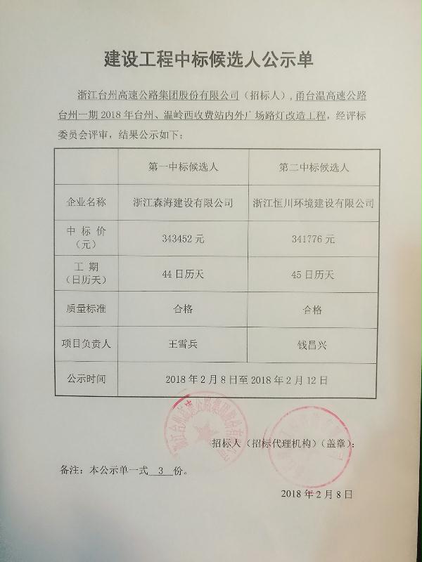 2018年臺州、溫嶺西收費站內(nèi)外廣場路燈改造工程中標(biāo)候選人公示單