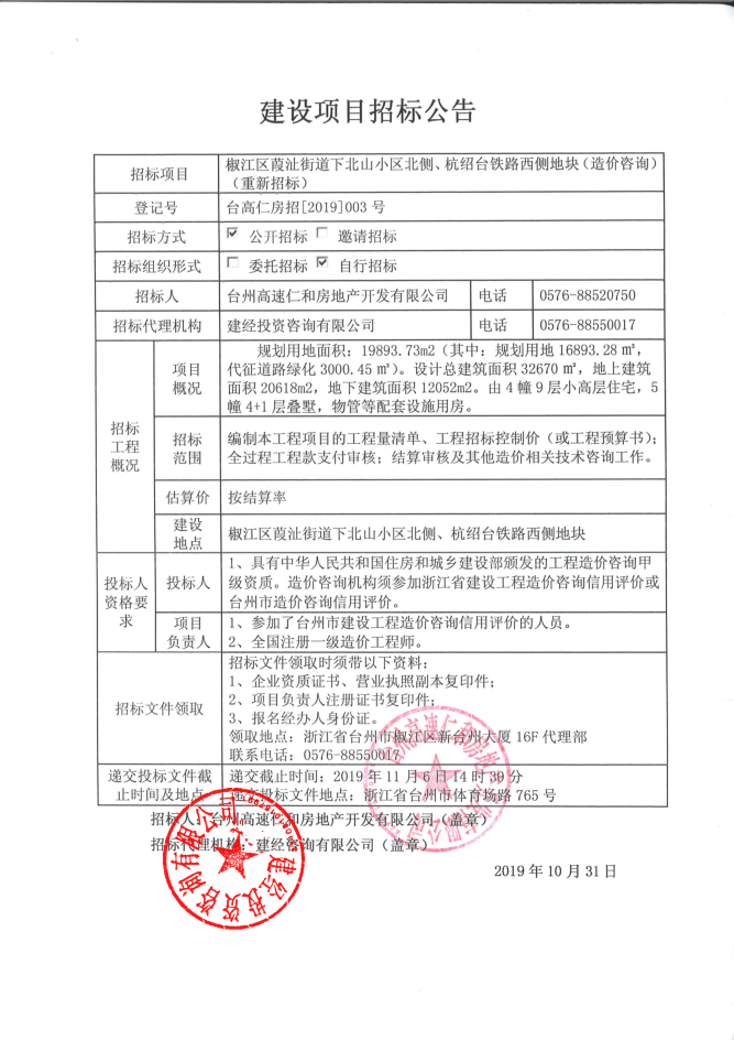 椒江區(qū)葭沚街道下北山小區(qū)北側(cè)、杭紹臺鐵路西側(cè)地塊(造價咨詢)招標(biāo)