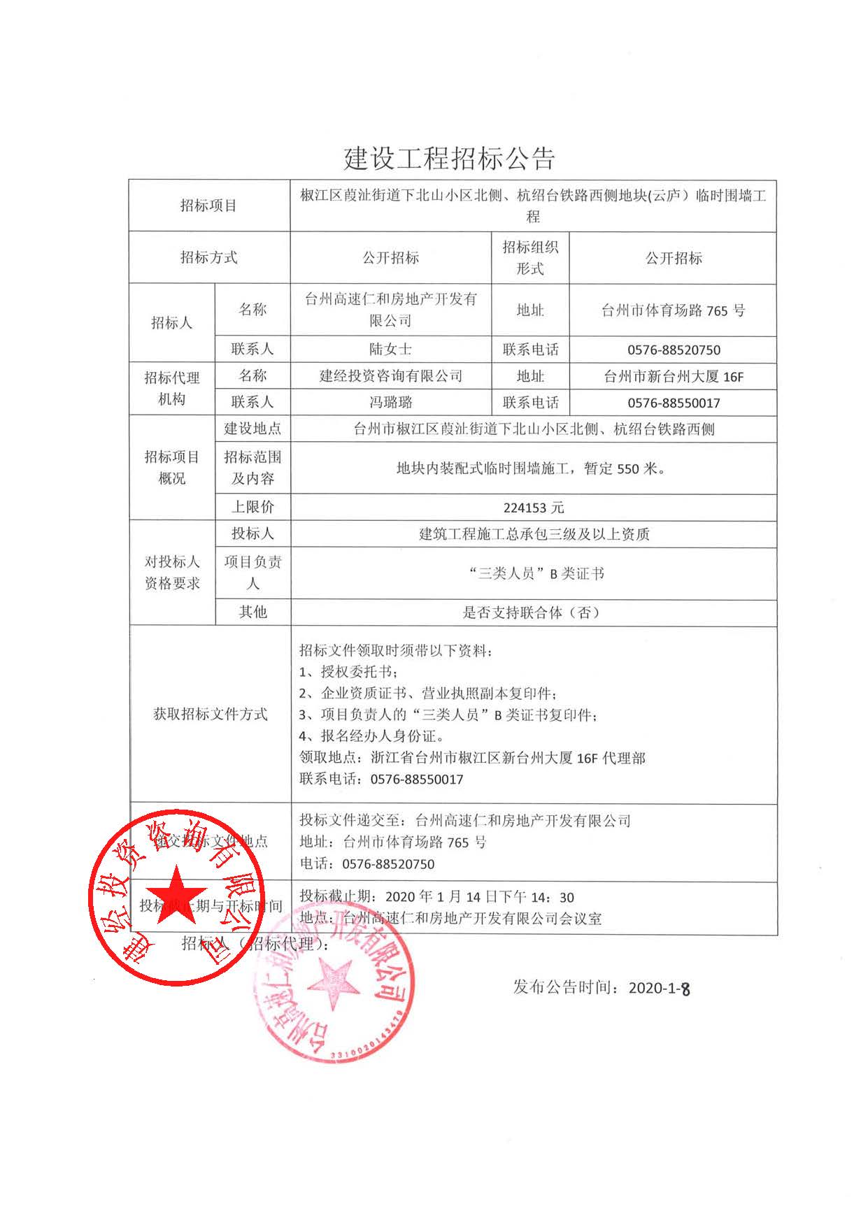 椒江區(qū)葭沚街道下北山小區(qū)北側(cè)、杭紹臺鐵路西側(cè)地塊(云廬)臨時圍墻工程招標(biāo)公告
