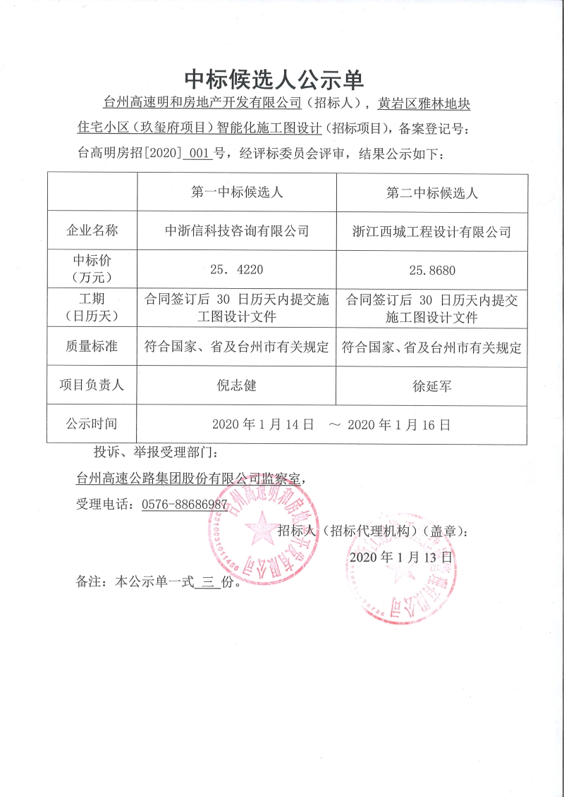 黃巖區(qū)雅林地塊住宅小區(qū)(玖璽府項(xiàng)目)智能化施工圖設(shè)計(jì)中標(biāo)候選人公示單