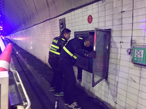 圖為工作人員檢查消防設(shè)備 冬日的隧道內(nèi)寒風(fēng)刺骨,執(zhí)勤隊(duì)員在轟鳴不止的噪音以及嗆人的汽車(chē)尾氣中,有條不紊地開(kāi)始隧道清洗及設(shè)備檢修工作。一組人員站在登高車(chē)站臺(tái)上,檢修故障攝像機(jī)及燈具,擦拭隧道內(nèi)每個(gè)攝像機(jī)鏡頭、LED燈具。一組人員手持電筒,打開(kāi)每一個(gè)消防設(shè)備箱,逐一檢查水帶、消防水龍頭、管道閥門(mén)等設(shè)施設(shè)備,仔細(xì)地排查各類(lèi)安全隱患。 “再等2號(hào)故障攝像頭檢修清洗結(jié)束后回來(lái)。”已過(guò)下午1點(diǎn)鐘,黃土嶺隧道所副所長(zhǎng)盧祖理還沒(méi)吃午飯,仍然埋頭于工作。