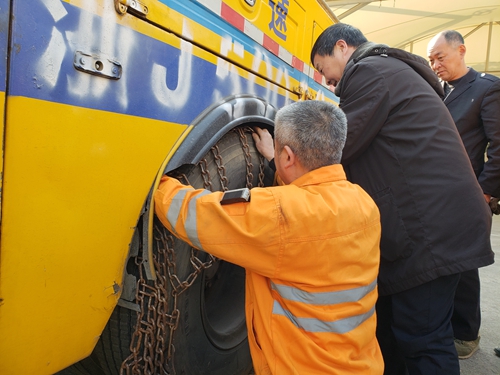 圖為捆綁好的防滑鏈 輪胎捆綁防滑鏈?zhǔn)擒囕v行駛在冰天雪地中增加輪胎對(duì)路面的摩擦力,以防止打滑的一項(xiàng)安全措施。雖然在南方這樣的氣候很少見,在實(shí)際工作中也較少遇到,但是施救中心每年都會(huì)開展相關(guān)的操作演練,并且要求全體員工務(wù)必熟練操作,此是安全預(yù)防的重要工作之一。