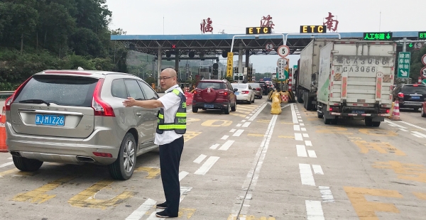 節(jié)日期間,車(chē)流量比往日多很多,每天多次出現(xiàn)長(zhǎng)時(shí)間大分流,一遇上高峰期車(chē)輛源源不斷地從各個(gè)方向匯聚在此,容易造成內(nèi)外廣場(chǎng)堵車(chē)。臨海南收費(fèi)所車(chē)輛雖多,但該站所出口秩序井然,未出現(xiàn)擁堵現(xiàn)象。瞧!這位在車(chē)流中,身著反光背心在這場(chǎng)大車(chē)流中,揮舞著雙臂指揮著交通,讓飛馳的車(chē)輛通過(guò)客貨分離,有效降低客貨車(chē)隨意串道,達(dá)到快速放行的是四班班長(zhǎng)楊俊輝。