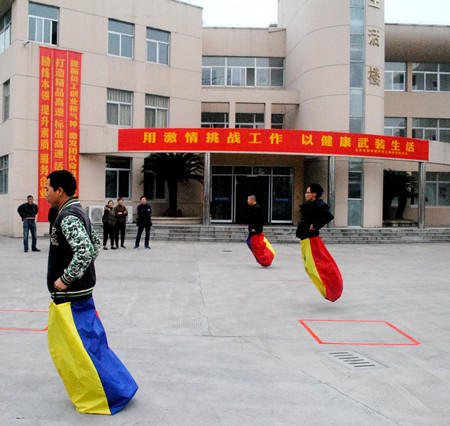 圖為“跳袋鼠”比賽 上午9點(diǎn)整,隨著臺(tái)州收費(fèi)所所長(zhǎng)、分工會(huì)會(huì)長(zhǎng)王小勇的一聲令下,趣味競(jìng)技活動(dòng)正式拉開(kāi)帷幕。此是自分工會(huì)成立以來(lái)第一次組織的妙趣橫生的集體活動(dòng),參加人員個(gè)個(gè)摩拳擦掌、躍躍欲試,有的迫不及待地在一旁先練開(kāi)了。 此次趣味活動(dòng)本著“重在參與、愉悅身心、全民健身”的原則,以豐富員工健康向上的業(yè)余文化生活為目的,分集體和個(gè)人兩種比賽方式。集體項(xiàng)目有“二龍戲珠”、“齊心協(xié)力”、“我是喬丹”、“集體跳繩”共4項(xiàng);個(gè)人項(xiàng)目有“絕對(duì)公平”、“夾豆比賽”、“單人跳繩”、“跳袋鼠”、“車(chē)輪滾動(dòng)”共5項(xiàng)。在集體項(xiàng)目中,各隊(duì)配合默契,勇往直前;單人賽中,各位員工積極參與,有幾個(gè)為爭(zhēng)第一不小心摔倒,手掌擦破了皮,褲子摔破了也絕不放棄,爬起來(lái)繼續(xù)參加比賽,堅(jiān)持到最后。