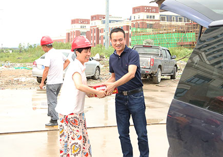 圖為仁和房產(chǎn)董事長(zhǎng)羅小將向施工單位代表遞送慰問(wèn)品